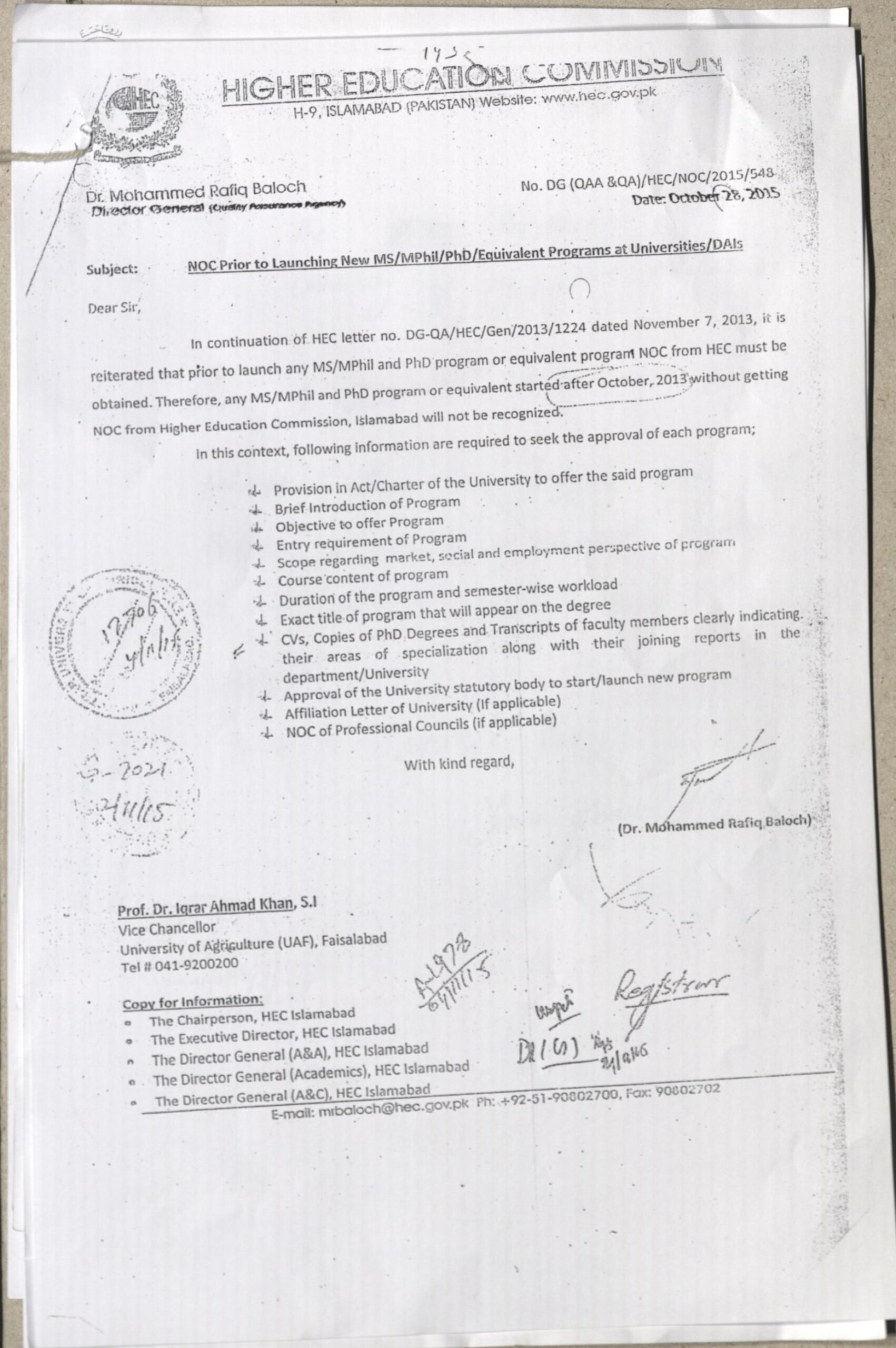 NOC Prior to Launching New MS/M.Phil/Ph.D/Equivalent Programs at Universities/DAIs